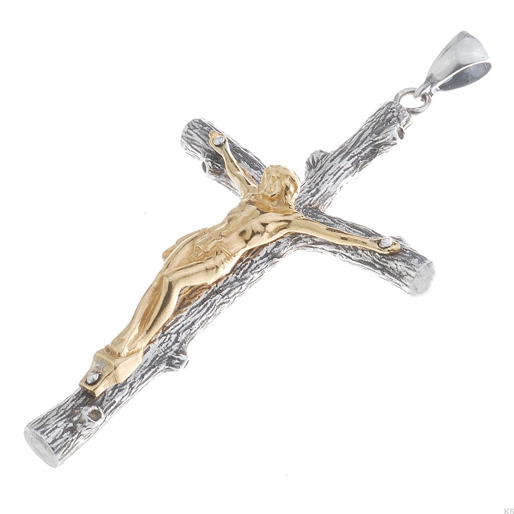 Autorski srebrny krzyżyk Konar łączy sakralny symbol z rzemieślniczą precyzją. Pełnoplastyczny odlew ze srebra próby 925 ukazuje wizerunek Chrystusa, który jest dodatkowo pozłacany, tworząc subtelny kontrast między oksydowanym tłem a złotym detalem. Ręczne oksydowanie nadaje antyczną patynę i podkreśla każdą wypukłość.