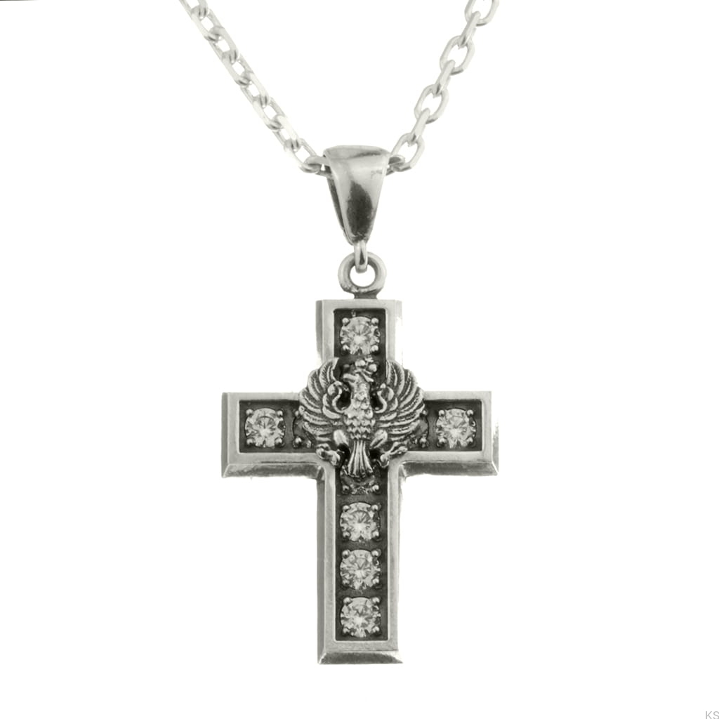 Autorskie wykonanie ze srebra próby 925 przedstawia orła w koronie – symbol polskiej tożsamości. Ramiona krzyża zdobi dziesięć lśniących białych cyrkonii, a każdy etap ręcznego wykańczania i oksydowania nadaje mu wyrazistą, antyczną patynę. Otwór zawieszki 5 × 6 mm pasuje do większości łańcuszków; na życzenie przygotujemy większe oczko.