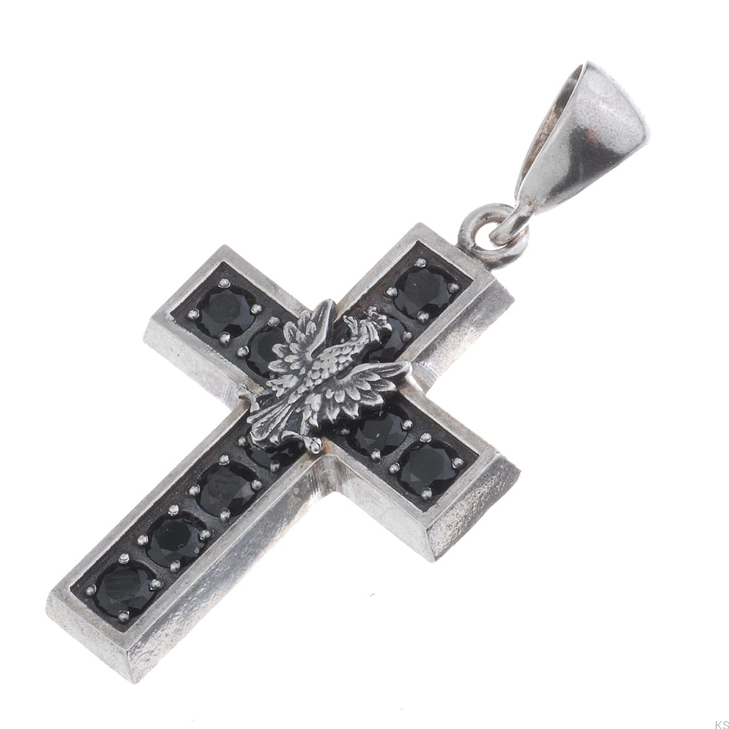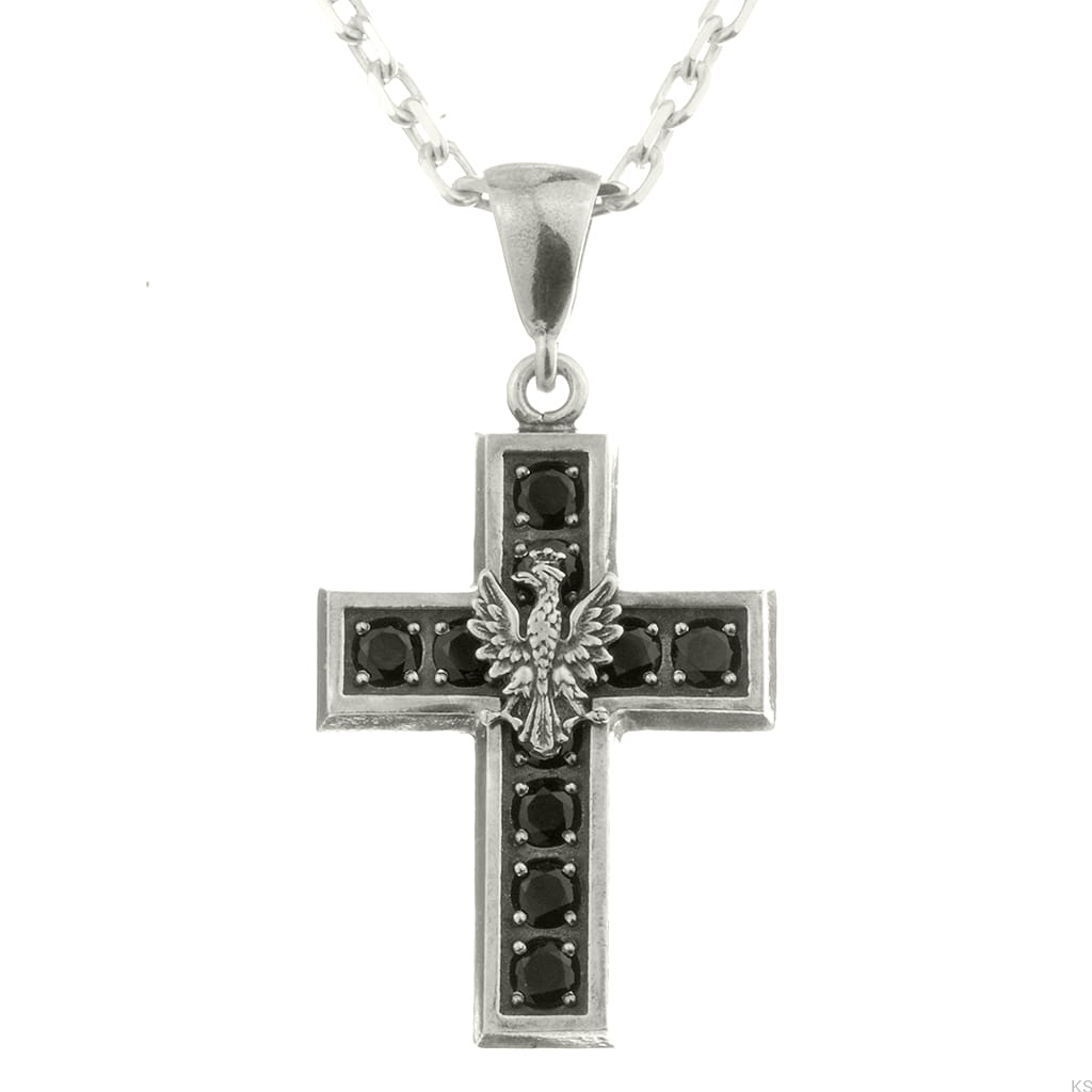 Autorskie wykonanie ze srebra próby 925 przedstawia orła w koronie – symbol dumy narodowej. Czarna biżuteria była noszona w okresie poprzedzającym powstanie styczniowe jako manifest patriotyczny, a po jego upadku stała się znakiem narodowej żałoby. Ramiona krzyża zdobi dziesięć czarnych cyrkonii, a ręcznie wykańczany i oksydowany proces nadaje mu głęboką, antyczną patynę. Otwór zawieszki 5×6 mm pasuje do większości łańcuszków; na życzenie przygotujemy większe oczko.