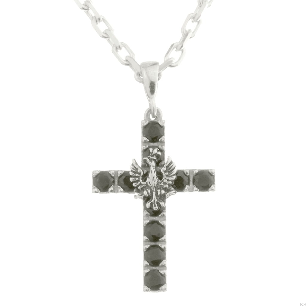 Autorskie wykonanie ze srebra próby 925 przedstawia orła w koronie – ucieleśnienie narodowej tożsamości. Krzyżyk zdobi dziesięć czarnych cyrkonii, a ręcznie wykańczany i oksydowany proces nadaje mu głęboką, antyczną patynę. Czarne kamienie nawiązują do biżuterii noszonej podczas powstania styczniowego jako wyraz patriotycznego manifestu i narodowej żałoby. Otwór zawieszki ma wymiary 3 × 4 mm, ale na życzenie dopasujemy go do grubszych łańcuszków.