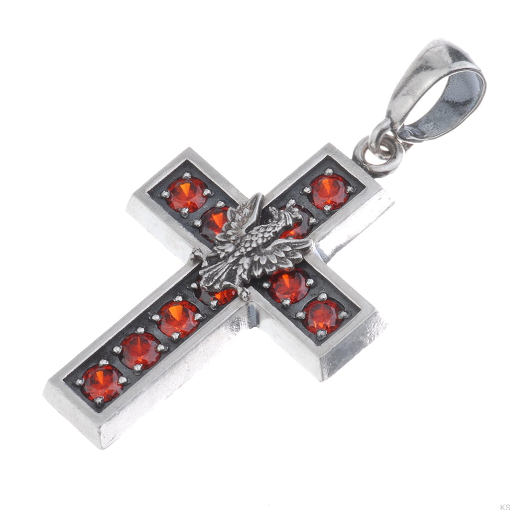 Autorskie wykonanie ze srebra próby 925 przedstawia orła w koronie – symbol dumy narodowej. Ramiona krzyża zdobi dziesięć czerwonych cyrkonii, a ręcznie wykańczany i oksydowany proces nadaje mu subtelną, antyczną patynę. Otwór zawieszki 5×6 mm pasuje do większości łańcuszków, na życzenie wykonamy większe oczko.